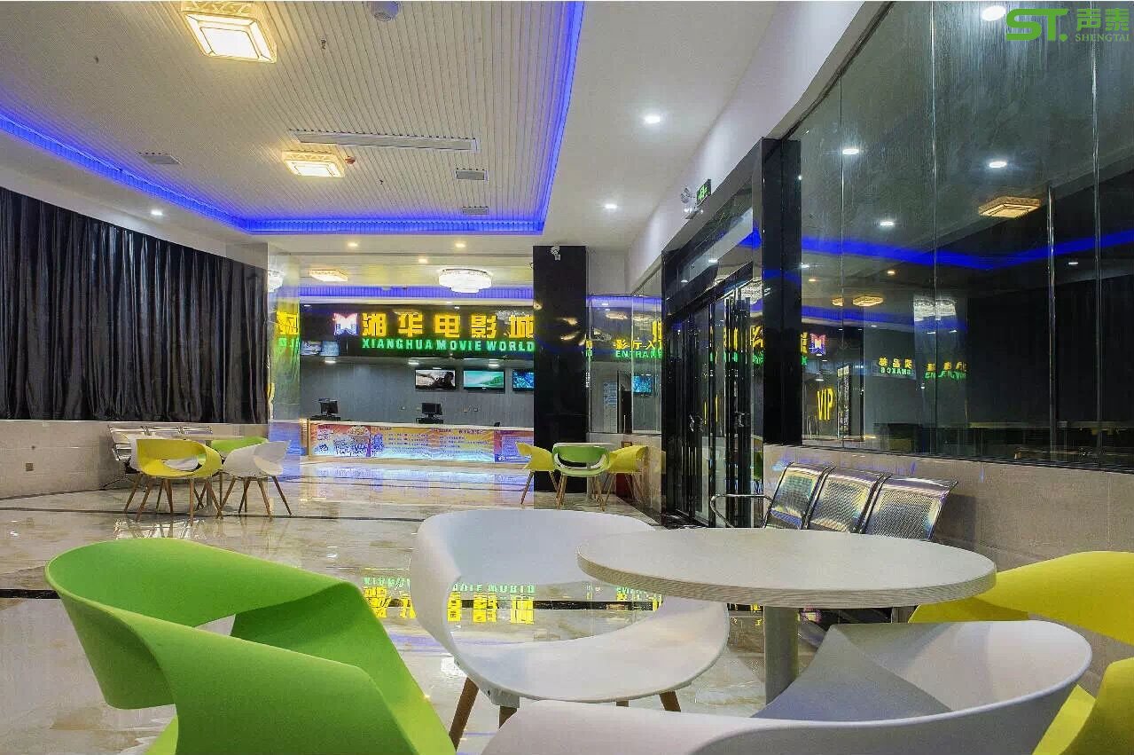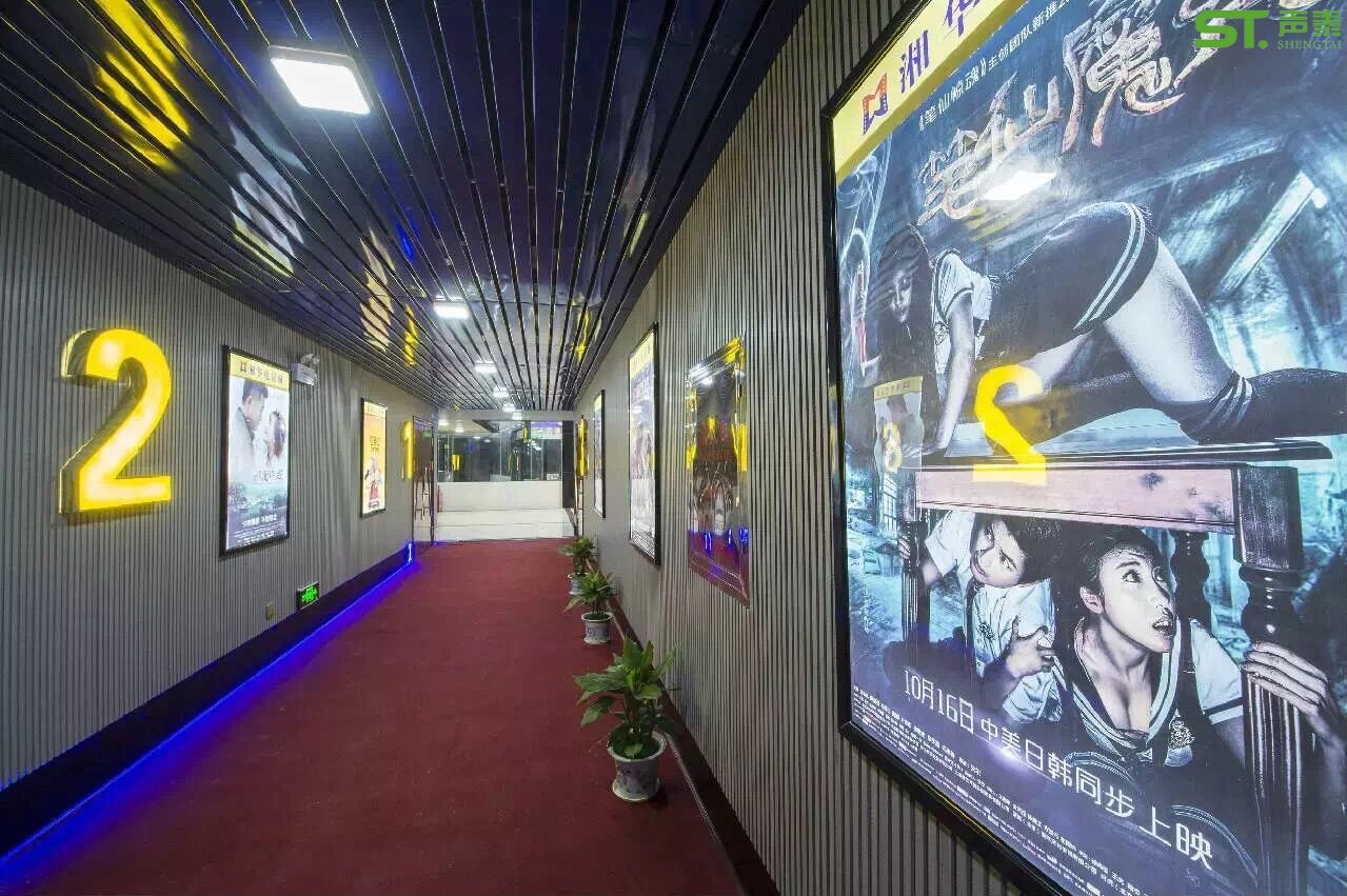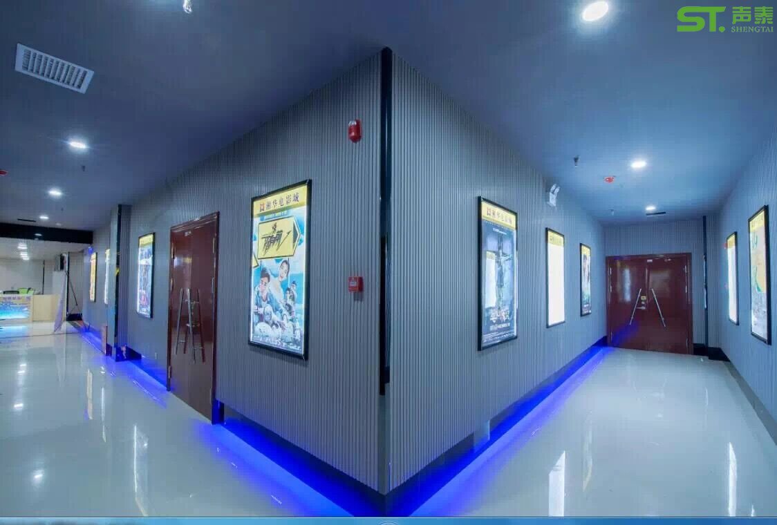 湖南郴州湘華電影城共采用三種吸音材料:環保槽木吸音板、生態木穿孔吸聲板、防火聚酯纖維吸音板。電影院收銀臺墻面與吊頂位置采用生態木穿孔吸音板、影城走廊兩側采用環保13/3槽孔吸音板。影視廳內墻面采用聚酯纖維吸音板。聚酯纖維吸音板共用800㎡,環保槽孔吸音板210平方米,生態木穿孔吸聲板185平方米