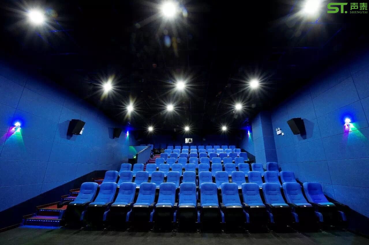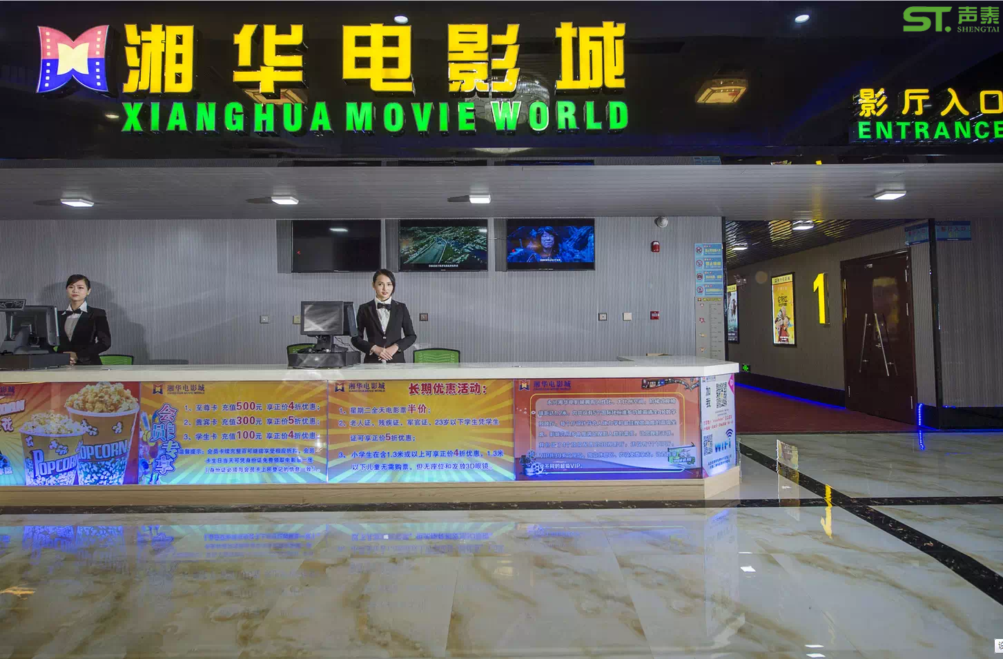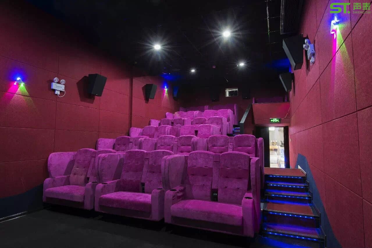 湖南郴州湘華電影城共采用三種吸音材料:環保槽木吸音板、生態木穿孔吸聲板、防火聚酯纖維吸音板。電影院收銀臺墻面與吊頂位置采用生態木穿孔吸音板、影城走廊兩側采用環保13/3槽孔吸音板。影視廳內墻面采用聚酯纖維吸音板。聚酯纖維吸音板共用800㎡,環保槽孔吸音板210平方米,生態木穿孔吸聲板185平方米