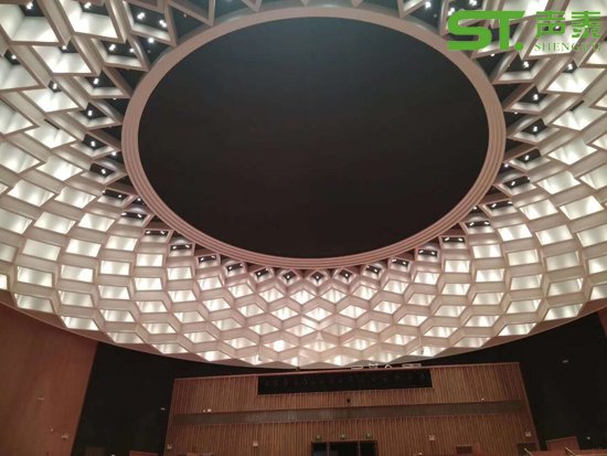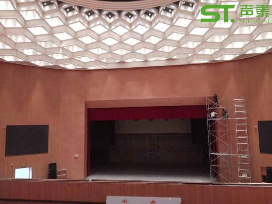 供應材料分別有:陶鋁微孔吸音板,木飾面干掛板,無甲醛彈性鋁框吸聲軟包,尖劈擴散體