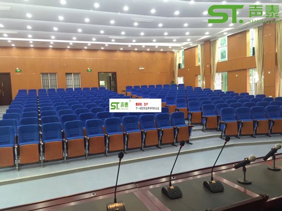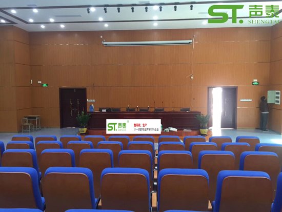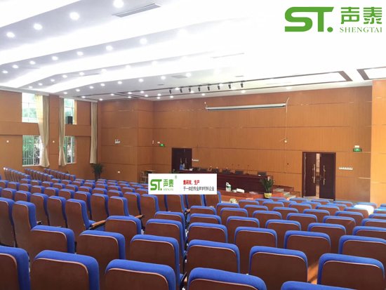 佛山南海西樵高級中學報告廳聲學材料這塊由‘聲泰聲學’中標,該工地共采用我司‘28-4型槽孔吸聲板800來㎡,皮革吸聲軟包200㎡,目前已經投入使用