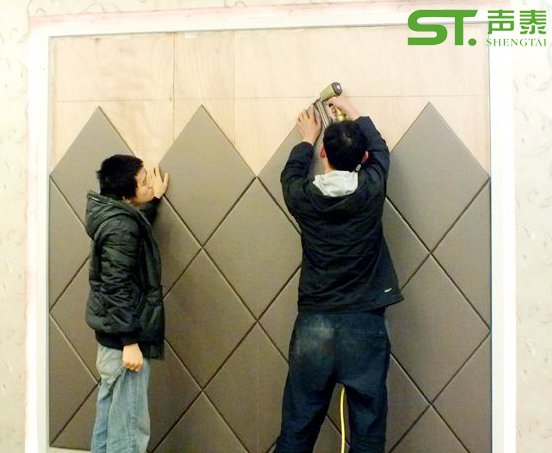 7.1直接鋪貼法吸音板安裝:用釘粘結合的方法,即成品吸音板,再用蚊釘從布紋縫隙釘入,必須注意氣釘不要打斷織物纖維,固定到墻面底板上。