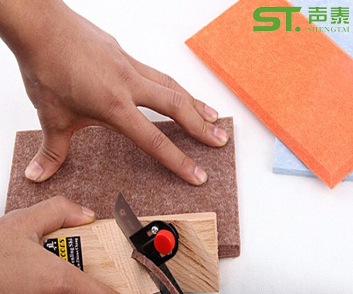 在施工中需要對聚酯纖維吸音板面進行切割,切割時建議用鋼尺或合金方鋼作為靠尺,切勿用木條或軟性材料作為靠尺,以避免切割線條不直造成拼接縫隙過大或扭曲。為使拼接縫隙相對減少,在切割時可將刀片向內傾斜0.5~1mm,使接口面形成內斜面,施工中易于板面對接,減少縫隙度。
