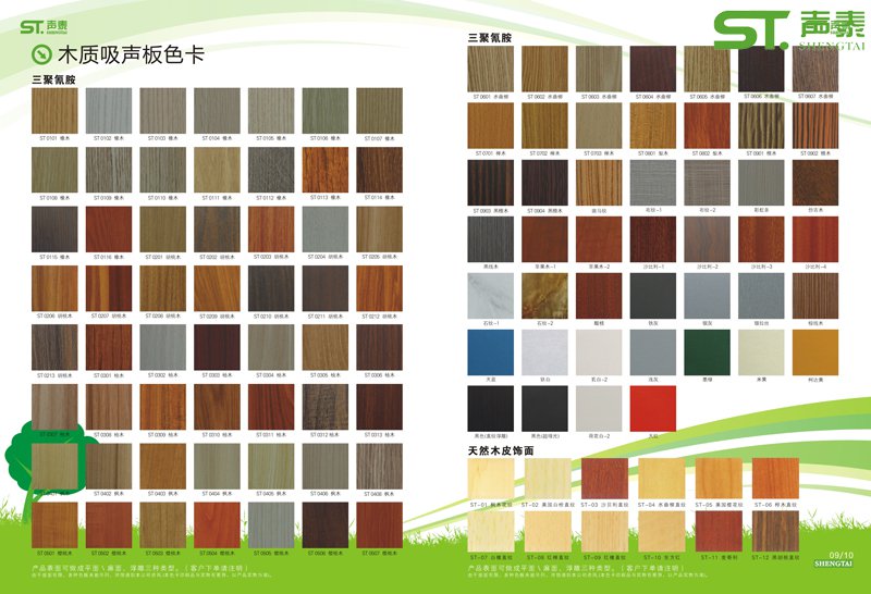 木質槽孔吸音板指的是槽木吸音板與孔木吸音板。兩種吸音板顏色,飾面,基材,型號都可根據客戶要求定做。木質槽孔吸音板常規做的顏色有紅櫻桃,楓木,櫸木,沙比利等。很多客戶會問到除了這幾種顏色還可以做哪些顏色呢?現在由小編上傳木質穿孔吸音板的色卡,供客戶選擇。