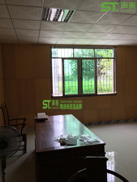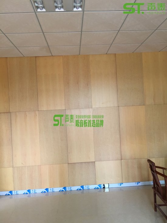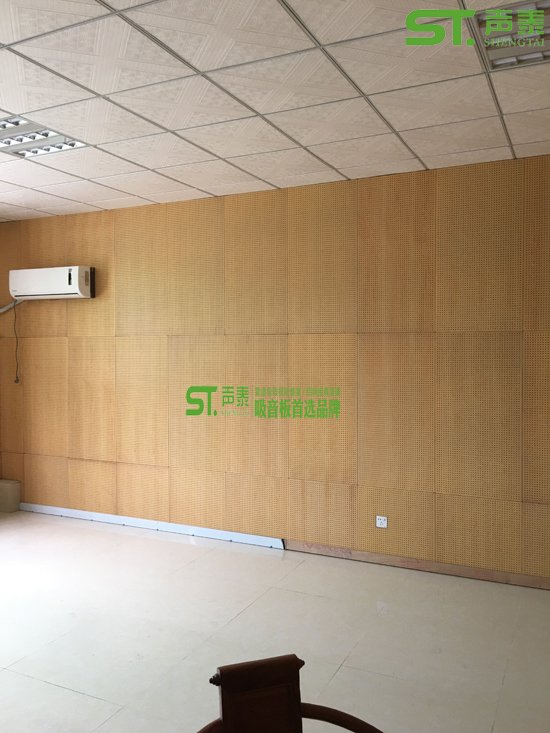 以下是我司承接某公司辦公洽談室的吸音裝修,墻面所采用的是木飾面孔木吸音板、木飾面裝飾板、天花所采用的是礦棉吸音板,該辦公洽談室沒做吸音之前混響時間高達8秒,經過我司聲學裝飾處理之后該室內混響時間2秒左右!接下來展示一下木紋飾面吸音板與裝飾板完美搭配的安裝效果圖!