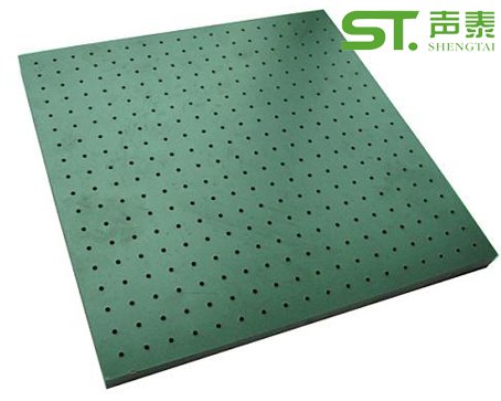 孔木吸音板是一種在密度板上直接穿孔的共振吸聲材料。孔木吸音板對吸聲頻譜選擇性較強,對低頻有很好的吸聲性能。如在吸聲結構后空腔上填入適量的吸聲棉可提高中、高頻吸聲效果。