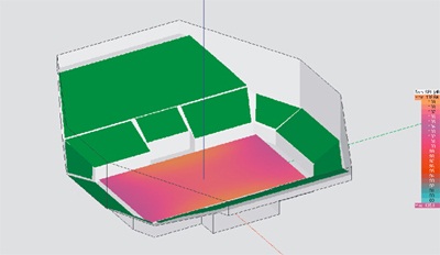 2.在新的裝飾改建中重新將原使用了近10年的四周墻面已吸音效果不佳穿孔吸音板更換為防火阻燃的新型結構的穿孔吸音板。觀眾席側墻安裝成品木質吸音板,吸音板穿孔率大于10%,木質吸音板后放置32kg/m3×50mm吸音棉板,留50mm空腔。在屋頂的網架上重新增加了質量輕的中空三棱柱的空間吸聲體。通過這樣大范圍的建聲改進
