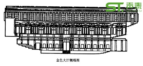 而宴會大廳的屋頂,有九個三角型大鋼結構架,架在兩邊承重墻上,負荷著屋頂的重量,鋼架上伸下根根鋼筋,吊起云杉木料的天花。天花上面鋪了磚塊,天花的表面涂上了石膏灰泥,外表鍍金,形成了一個略有彈性的大天花。整個天花上面的空間形成了一個巨大的共鳴箱。這也是造就金色大廳優良音質的重要原因。