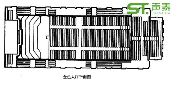 維也納宴會大廳寬20米、高17.5米、長35米。資料記載大廳容積15000立方米,座位1680座,站位500,每席容積8.9立方米。滿場中頻(500Hz)混響時間2.1秒。金色大廳建成后,其優良的音質一直受到人們的高度評價。難能可貴的是當時美國的賽賓尚未研究提出混響時問的計算公式即賽賓公式,而現今廣為采用的廳堂混響計算艾潤公式則是1930年才被研究提出的。