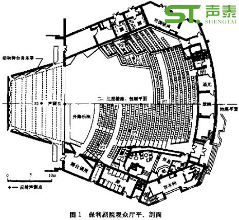 傳統的馬蹄形多層包廂歌劇院形式之所以有巨大的生命力,其主要優點在于:縮短視距,增加直達聲強度而使后座有足夠的音量,大廳各界面有均勻的聲吸收,此外,還有觀眾對舞臺的圍合作用而產生親切感。它的缺點是:高層和臺口側座的視覺很差,穹頂和弧形圍墻不能給觀眾提供早期反射聲,難以設置多道面光和耳光,不能滿足現代歌劇演出的需要,對此,保利劇院采用三層樓座,兩側為跌落包廂,池座平面接近矩形,使前中座有足夠強和覆蓋面較大的側向早期反射聲。后面的弧形墻和包廂欄板設置擴散面,吊頂作雙向彎曲的定向反射面,加強后座的聲級。這些措施,消除了傳統歌劇院形式的缺點,繼承了視距短和良好圍合作用等的優點。圖1和圖2為觀眾廳的平、剖面和內景。