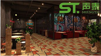 咖啡廳的聲學設計中,并沒有多少的音質方面的設計,大多注重的是空間美感與語言私密度結合。尤其是在辦公樓附近的咖啡廳,對語言私密度極高。這類的咖啡廳,我們建議座位與座位之間加以隔斷,可以是墻、矮墻配以植物或者用簾幕阻斷,盡量保證其語言清晰度的情況下,又能迎合咖啡廳的整體裝飾。語言清晰度的要求就是,面對面交談清晰的了解對方的意思,而毗鄰的座位沒有較高的可懂度,甚至聽不見臨近座位的聲音。