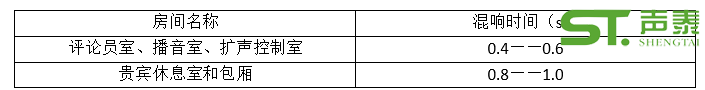 2、綜合體育場館內不僅僅是比賽大廳,還有一些輔助用房,由于其功能要求,對聲學環境有較高要求。根據《體育場館聲學設計及測量規程》JPJ/T 131——2012中規定,體育場館內對聲學環境有較高要求的輔助房間的混響時間宜符合表3的規定。