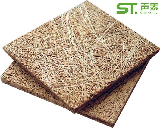 木絲吸音板由長纖維狀木絲和特殊的防腐、防潮無機膠粘材料、難燃劑混合壓模而成。憑借其在吸聲、裝飾、建筑環保等無與倫比的特性而令人信服。不但能降低噪音,而且能使混響達到國家聲學標準,使音質更加豐滿、清晰、富有立體感,且具有時尚的外觀,耐沖擊等特點。 可用作建筑物高檔裝修墻面及吊頂聲學產品的首選。