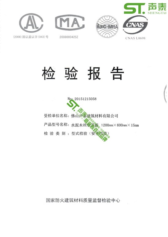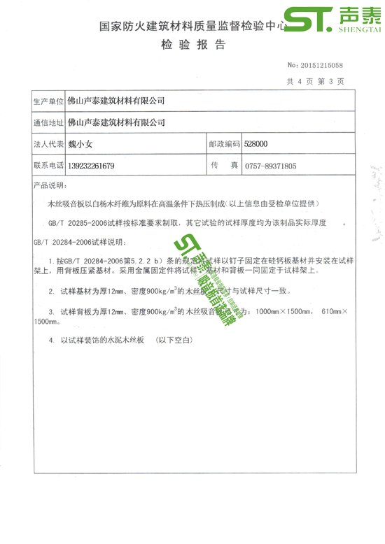 佛山聲泰木絲吸音板防火阻燃檢測報告